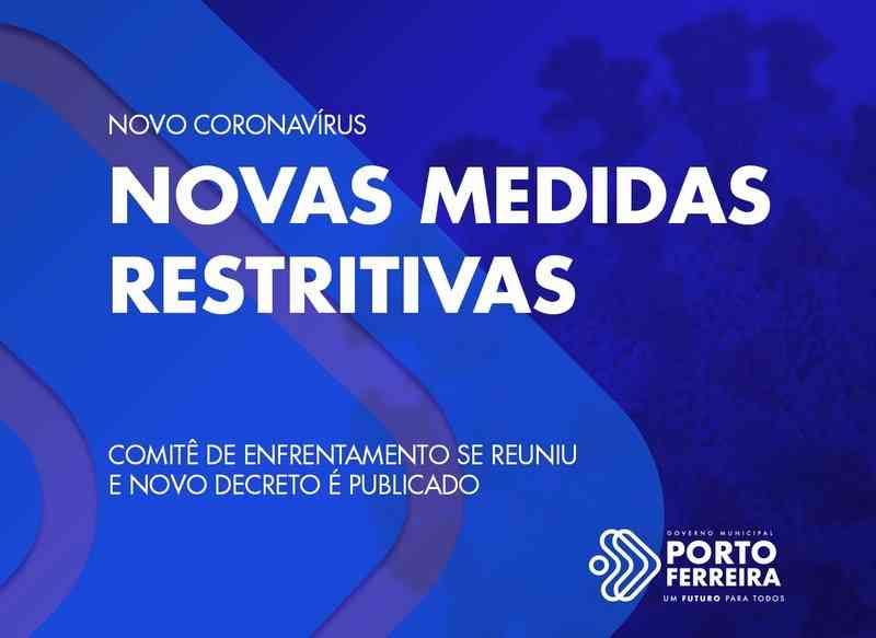 As novas medidas passam a valer a partir de segunda-feira (17/01) e constam de decreto municipal, que pode ser acessado AQUI. Ficam mantidas no Município de Porto Ferreira as normas previstas no Plano São Paulo, estando vedado o atendimento presencial e/ou realização de atividades que estejam proibidas pela regulamentação estadual e municipal. Lembrando que as atividades permitidas em cada fase são aquelas previstas no sítio eletrônico do Plano São Paulo, por meio do endereço https://www.saopaulo.sp.gov.br/planosp/.