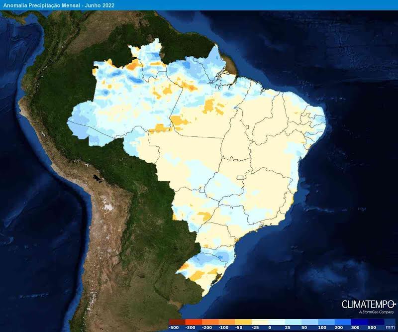 Em julho, uma boa parte do Norte e Nordeste terá precipitação dentro da média e acima da média na costa do Nordeste e extremo norte do Amazonas. O Centro e Sul do Brasil irão permanecer sob menos chuva e viés negativo de precipitação.