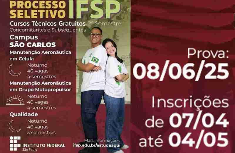 O Instituto Federal de São Paulo (IFSP) unidade de São Carlos está com inscrições abertas para seu processo seletivo de cursos técnicos gratuitos com início no segundo semestre de 2025. São 120 vagas distribuídas entre três modalidades: