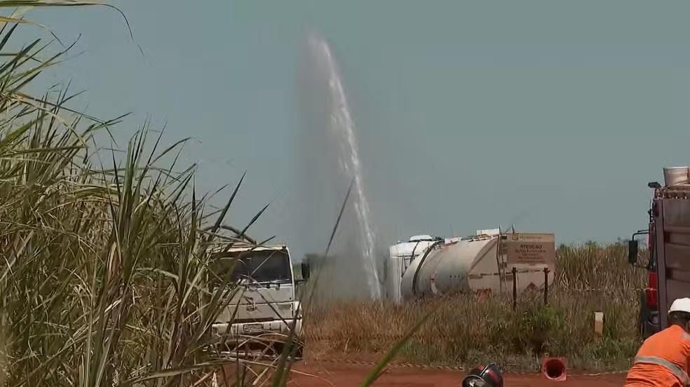 Gasolina jorrou a vários metros de altura entre Sales Oliveira e Orlândia após duto ser perfurado; suspeito foi preso e confessou participação no crime.