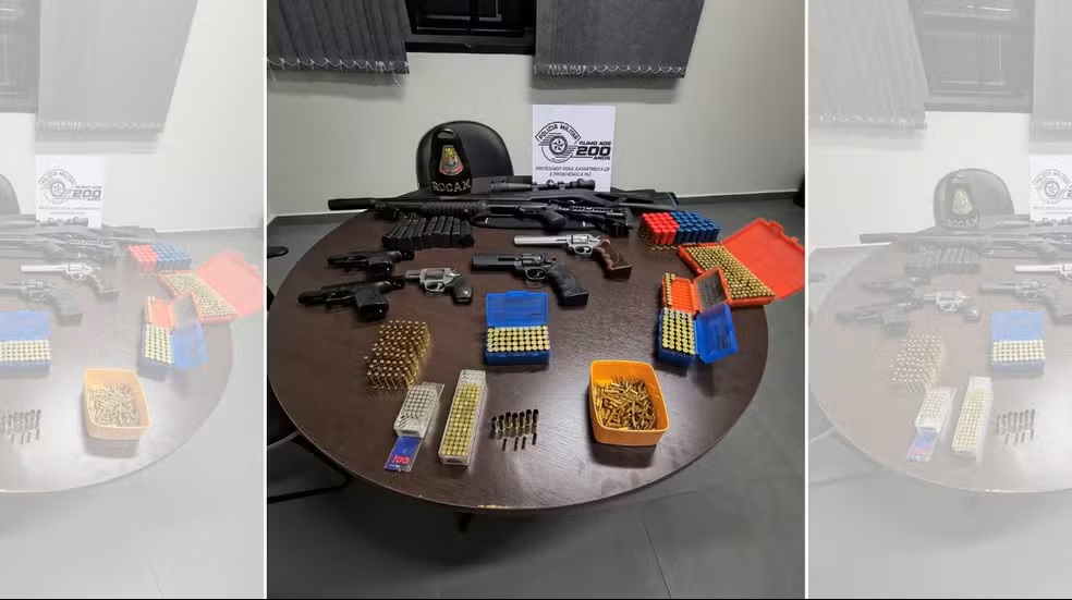 No apartamento, os agentes encontraram um verdadeiro arsenal. Foram apreendidos seis armas de fogo três revólveres, duas pistolas e uma espingarda calibre 12 além de uma carabina de pressão e mais de 770 munições de diversos calibres. Onze munições deflagradas também foram recolhidas pela perícia.