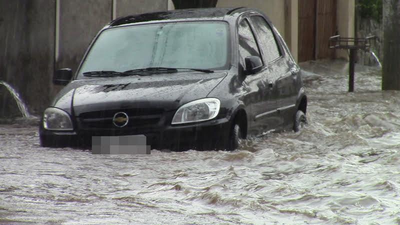 O córrego canalizado, que corta toda a extensão da Avenida, transbordou e deixou moradores ilhados. Carros e motos foram atingidos pela força da enxurrada.
