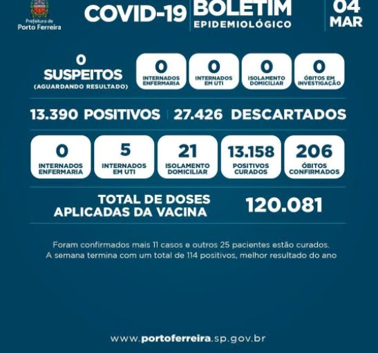 A Vigilância da Secretaria de Saúde de Porto Ferreira divulgou nesta sexta-feira (04/03) o Boletim Epidemiológico nº 688/2022, atendendo à determinação prevista no decreto municipal 1.281/2020.