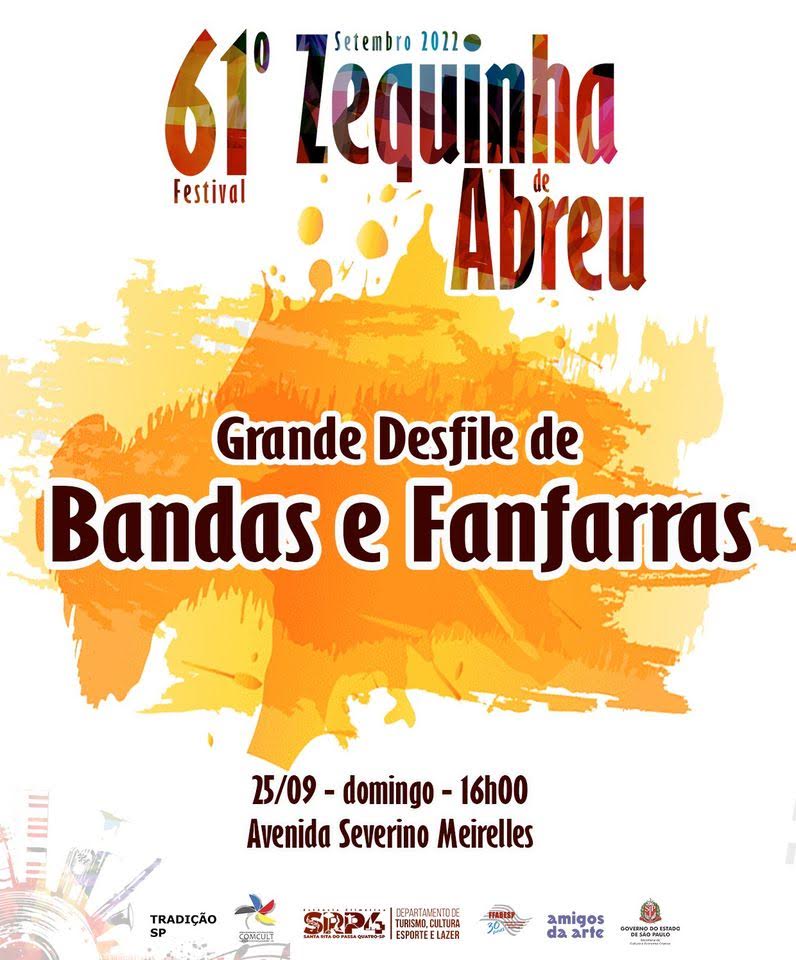 Neste domingo (25), as 16h00, a Avenida Severino Meirelles terá o grandioso Desfile das Bandas Marciais e Fanfarras, encerrando com chave de ouro o Festival Zequinha de Abreu.