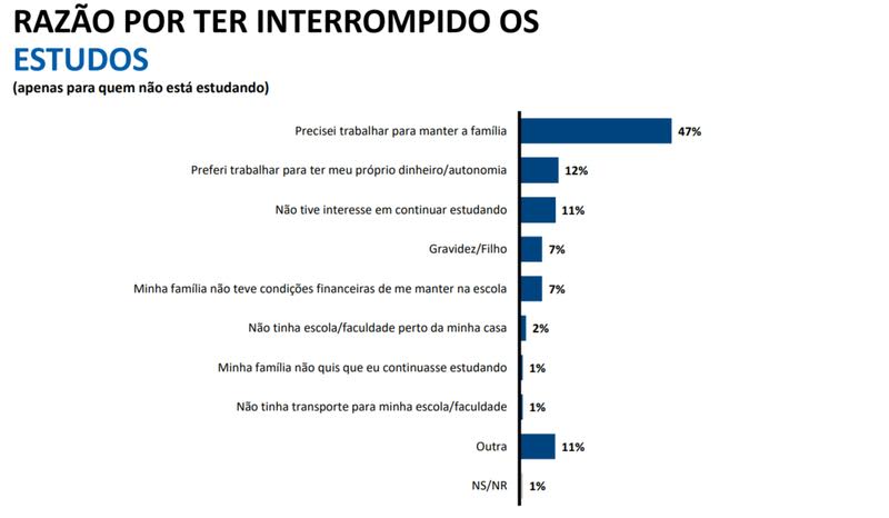 A necessidade de trabalhar para manter a família é o principal motivo (47%) para a interrupção dos estudos, seguida pelas pessoas que preferem trabalhar para ter o próprio dinheiro e autonomia (12%). Outros destaques foram o número alto de pessoas que deixam de estudar por falta de interesse (11%) e pessoas que interromperam por conta de gravidez ou filhos (7%).