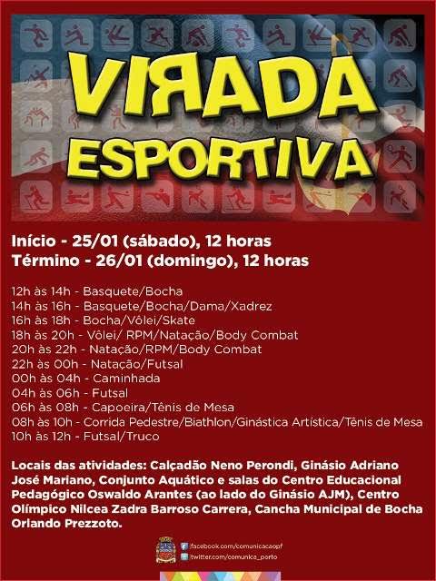 O Departamento de Esportes e Lazer da Prefeitura de Porto Ferreira divulgou hoje (14/01) uma nova programação da Virada Esportiva, com pequenas alterações.