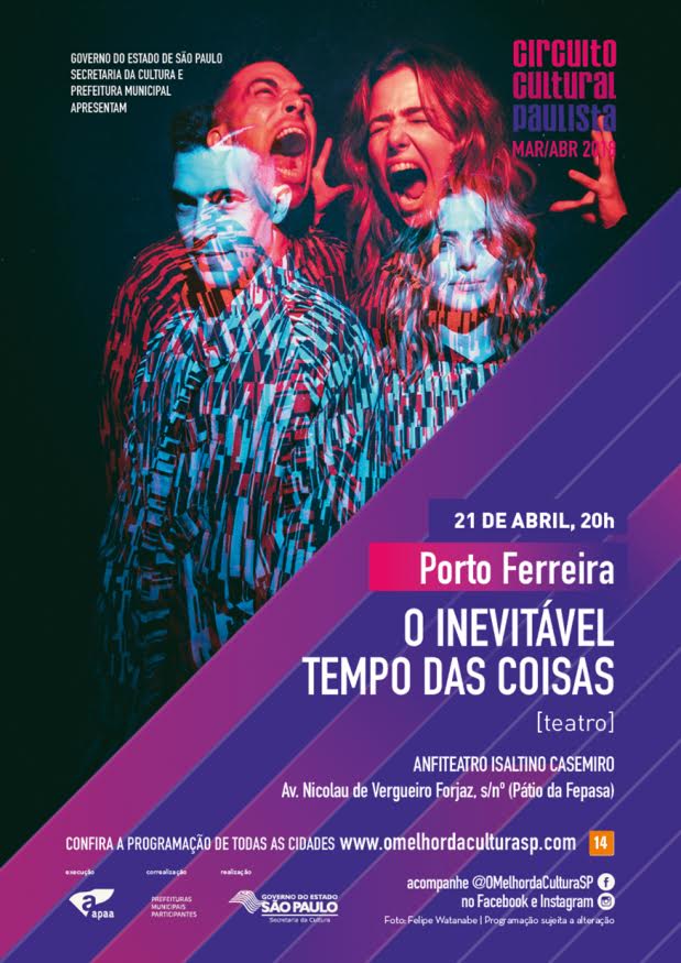A primeira atração será a peça “O Inevitável Tempo das Coisas”, no dia 21 de abril, a partir das 20 horas, no Anfiteatro Isaltino Casemiro.
