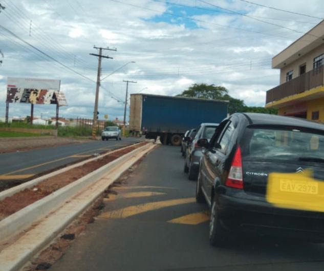 Pelo menos dez carros formaram uma fila aguardando a movimentação do veículo truck. Os motoristas tentaram uma manobra arriscada, invadindo o passeio público e cortando a parte dianteira do caminhão.
