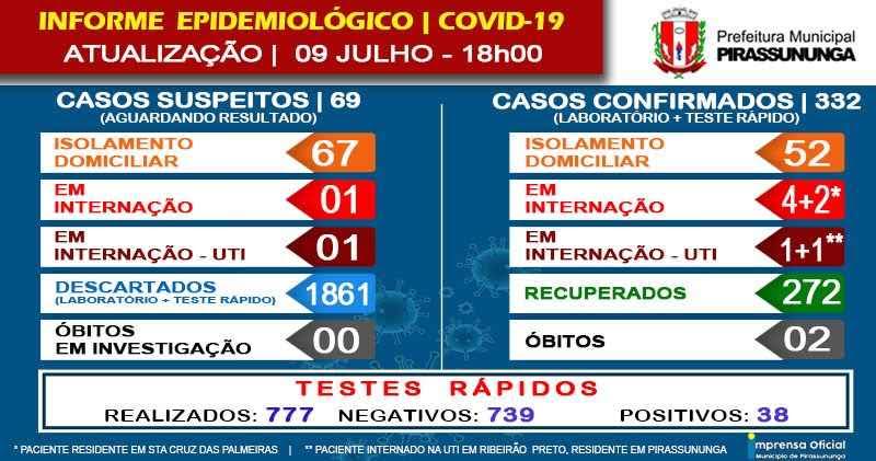 No início da noite de ontem quirta-feira (09/07), um novo boletim epidemiológico a respeito da situação do Covid-19 foi divulgado pela Prefeitura de Pirassununga.