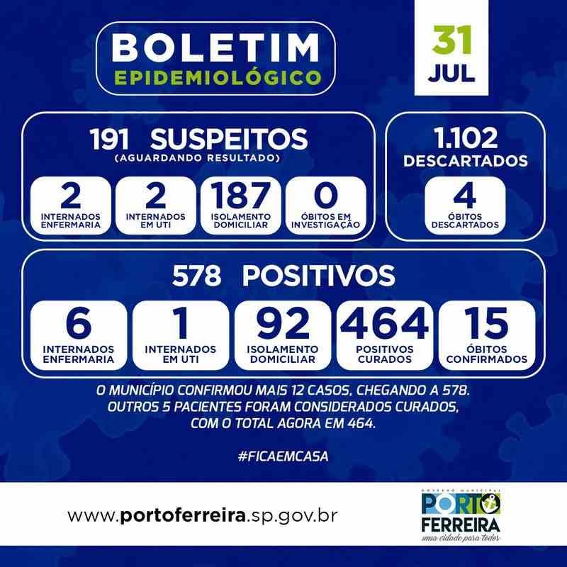 A Vigilância Epidemiológica da Secretaria de Saúde de Porto Ferreira divulgou nesta sexta-feira (31/07) o Boletim Epidemiológico nº 117/2020, atendendo à determinação prevista no decreto municipal 1.281/2020.