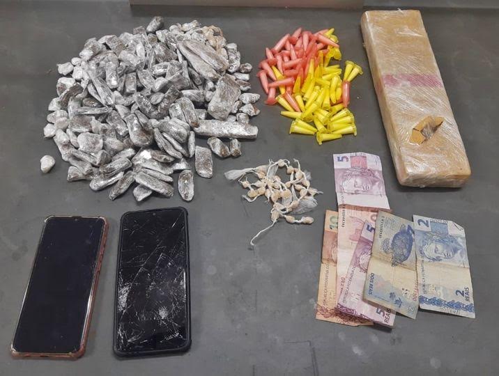 Já no terreno foi localizado o segundo indivíduo escondido, o qual tinha em sua posse, no bolso, dois eppendorfs com cocaína, R$29,00 e um aparelho celular e no saco plástico que trazia consigo, um tijolo de maconha e mais 138 porções da mesma droga.