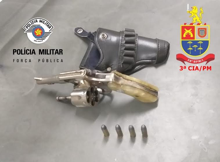 Em buscas no interior do veículo, foi localizado sob o banco dianteiro direito um revólver marca Taurus, calibre.32, inoxidado, municiado com quatro munições intactas, acondicionado em um coldre de couro cor preta, tendo sua numeração suprimida.