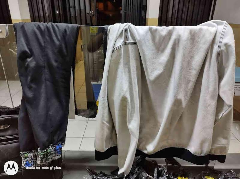 Foi também localizado uma mochila de cor preta em meio aos arbustos a cerca de três metros da motocicleta, onde continha em seu interior uma faca, as chaves da referida moto e as roupas utilizadas pelo autor do crime. Foi localizado enterrado aos pé de uma árvore um pacote plástico contendo em seu interior a quantia de 53 pedras de crack, 216 porções de maconha, 707 eppendorfs com cocaína e mais cinco pacotes com pó branco semelhante a mesma droga.