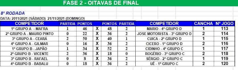 Confiram nas imagens os resultados da fase das oitavas e os confrontos das quartas.