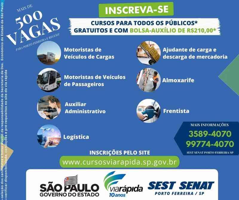 Serão aproximadamente 570 vagas disponibilizadas para Porto Ferreira e região para os cursos de Motoristas de Veículos de Cargas, Motoristas de Veículos de Passageiros, Almoxarife, Logística, Ajudante de Carga e Descarga de Mercadoria, Auxiliar Administrativo e Frentista.