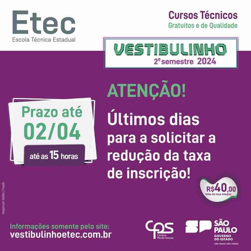 O processo seletivo das Escolas Técnicas Estaduais (Etecs) para o segundo semestre de 2024 está com inscrições abertas para os pedidos de redução de 50% do valor da taxa de inscrição. A solicitação do benefício deve ser feita até as 15 horas de hoje, terça-feira (2), pelo site vestibulinhoetec.com.br. O valor integral da taxa do Vestibulinho das Etecs é de R$ 40.