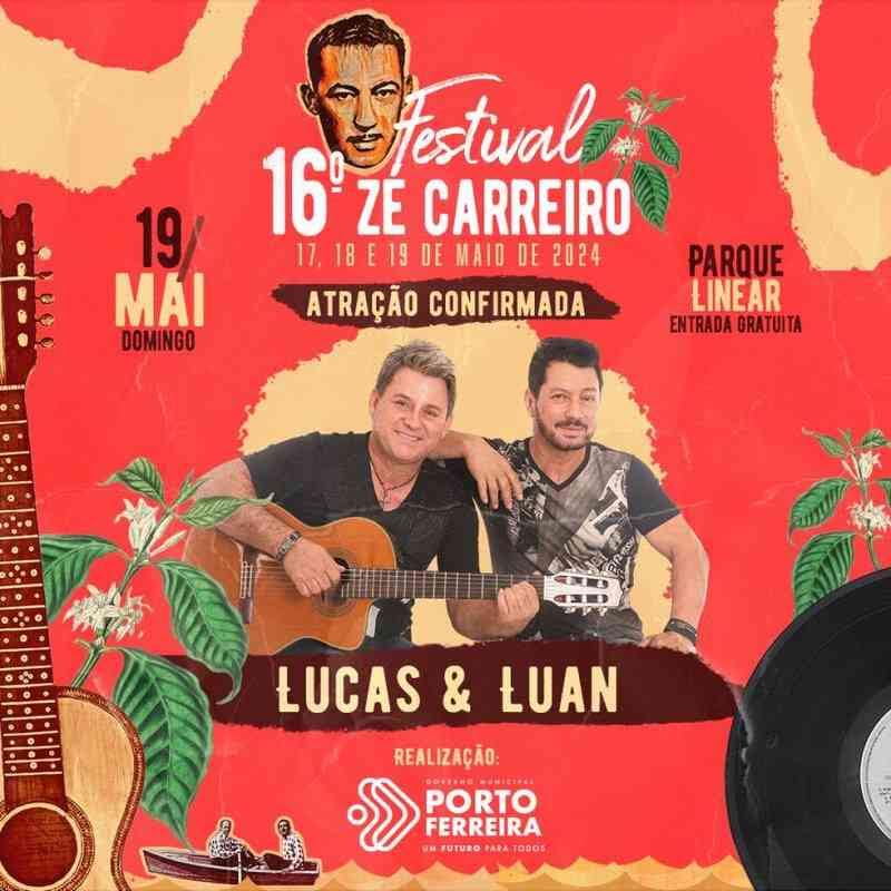 A Secretaria de Cultura e Economia Criativa de Porto Ferreira tem o prazer de anunciar mais uma atração confirmada para o aguardado 16º Festival de Música Raiz e Sertaneja Zé Carreiro. A dupla Lucas & Luan será mais uma das estrelas do evento, apresentando-se no domingo (19/05), logo após o encerramento da final do festival.