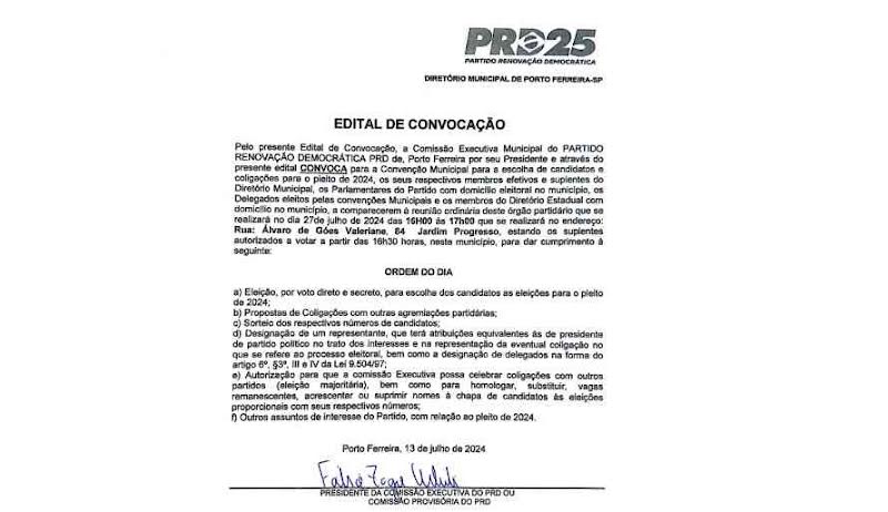 Eleições 2024: Diretório Municipal do PRD de Porto Ferreira publica edital para "Convenção"