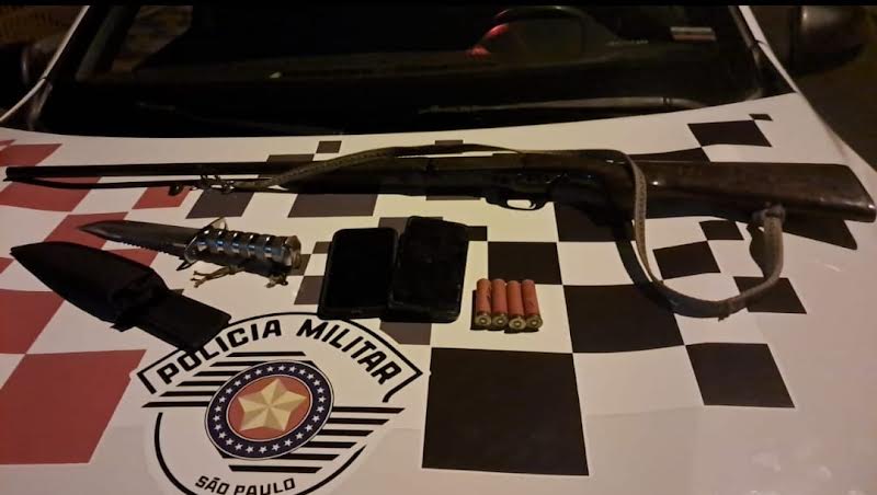 Após busca pessoal, foi localizada no bolso das vestes do indivíduo, 3 munições de arma de fogo e na cintura de um menor, que estava no veículo, foi localizada uma faca de selva embainhada. Ao efetuarem buscas no carro, foi encontrada uma arma de fogo CBC Gauge 28 carregada e pronta para uso.