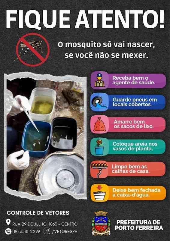 A Seção de Controle de Vetores reforça que é preciso que cada um continue o trabalho preventivo para eliminar possíveis criadouros do mosquito, mesmo com a diminuição das notificações. A principal medida é eliminar água parada.