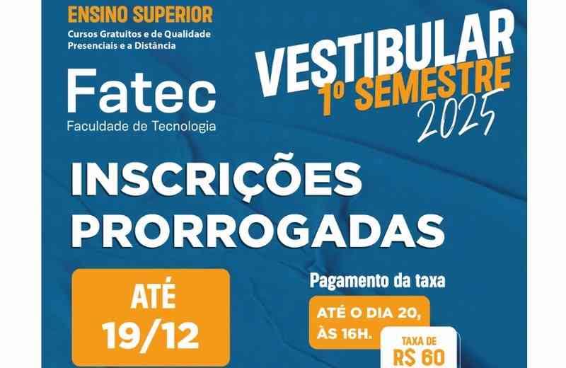 As inscrições para o processo seletivo das Faculdades de Tecnologia do Estado (Fatecs) para o primeiro semestre de 2025 foram prorrogadas até o próximo dia 19, exclusivamente pelo site vestibular.fatec.sp.gov.br. A taxa de participação é de R$ 60 e poderá ser paga até as 16 horas do dia seguinte (20). A prova do Vestibular das Fatecs será aplicada em 12 de janeiro de 2025.
