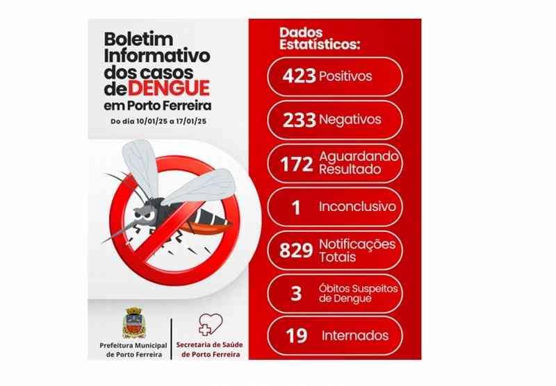 A Secretaria de Saúde de Porto Ferreira divulgou nesta quarta-feira (17) o mais recente boletim sobre os casos de dengue no município. Entre os dias 10 e 17 de janeiro de 2025, foram registradas 829 notificações da doença. Destas, 423 foram confirmadas como positivas, enquanto 233 casos tiveram resultado negativo e 172 seguem aguardando análise. Apenas um caso foi considerado inconclusivo.