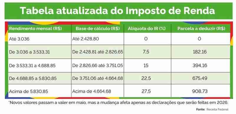 O presidente Luiz Inácio Lula da Silva editou a Medida Provisória nº 1.294, que corrige a tabela progressiva do Imposto de Renda. Os novos valores passam a valer em maio deste ano, mas a mudança afeta apenas as declarações que serão feitas em 2026. O Congresso Nacional tem agora 120 dias para analisar a medida.
