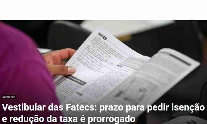 Os candidatos ao Vestibular das Faculdades de Tecnologia (Fatecs) do Estado de São Paulo ganharam mais tempo para solicitar isenção total e redução de 50% no valor da taxa de inscrição do processo seletivo. O Centro Paula Souza (CPS) estendeu o prazo até o dia 28, com objetivo de ampliar a oportunidade de acesso à formação superior tecnológica gratuita.
