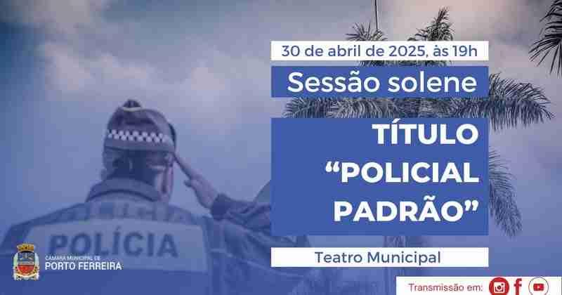 A Câmara Municipal de Porto Ferreira realizará, na próxima quarta-feira (30/04), a partir das 19h, sessão solene para a entrega dos Títulos de “Policial Padrão”, no Teatro Municipal “Gilberto Chateaubriand”, localizado na rua São Sebastião, 324, Centro.