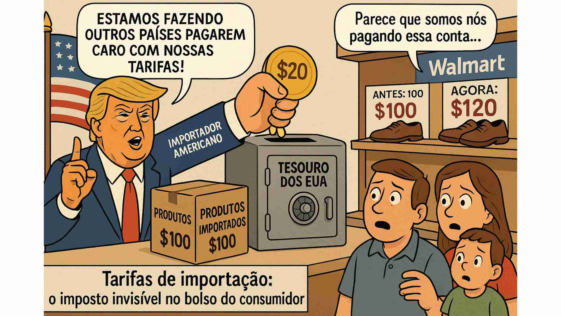 Por exemplo, se uma rede como o Walmart importa um par de sapatos de US$ 100 do Vietnã e essa importação está sujeita a uma tarifa de 20%, a empresa deve pagar US$ 20 em impostos ao governo. Esse valor, porém, não desaparece: ele se transforma em uma pressão sobre os custos da empresa.