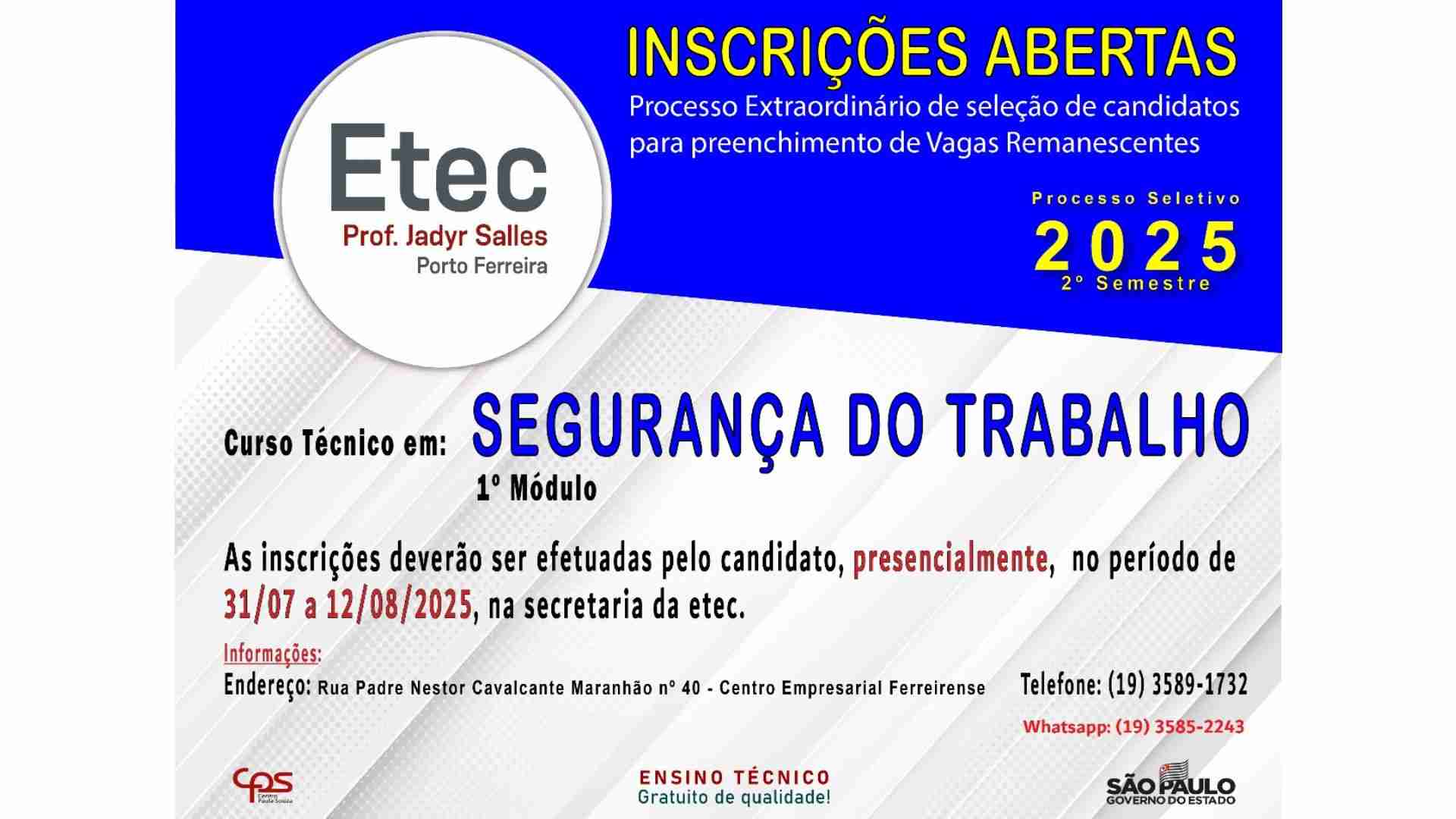 A Etec Professor Jadyr Salles, em Porto Ferreira (SP), está com inscrições abertas para o processo extraordinário de seleção do 1º módulo do Curso Técnico em Segurança do Trabalho. Os candidatos podem se inscrever presencialmente até o dia 12 de agosto, na secretaria da escola, localizada na Avenida Padre Nestor Cavalcante Maranhão, nº 40, no Jardim Aeroporto.