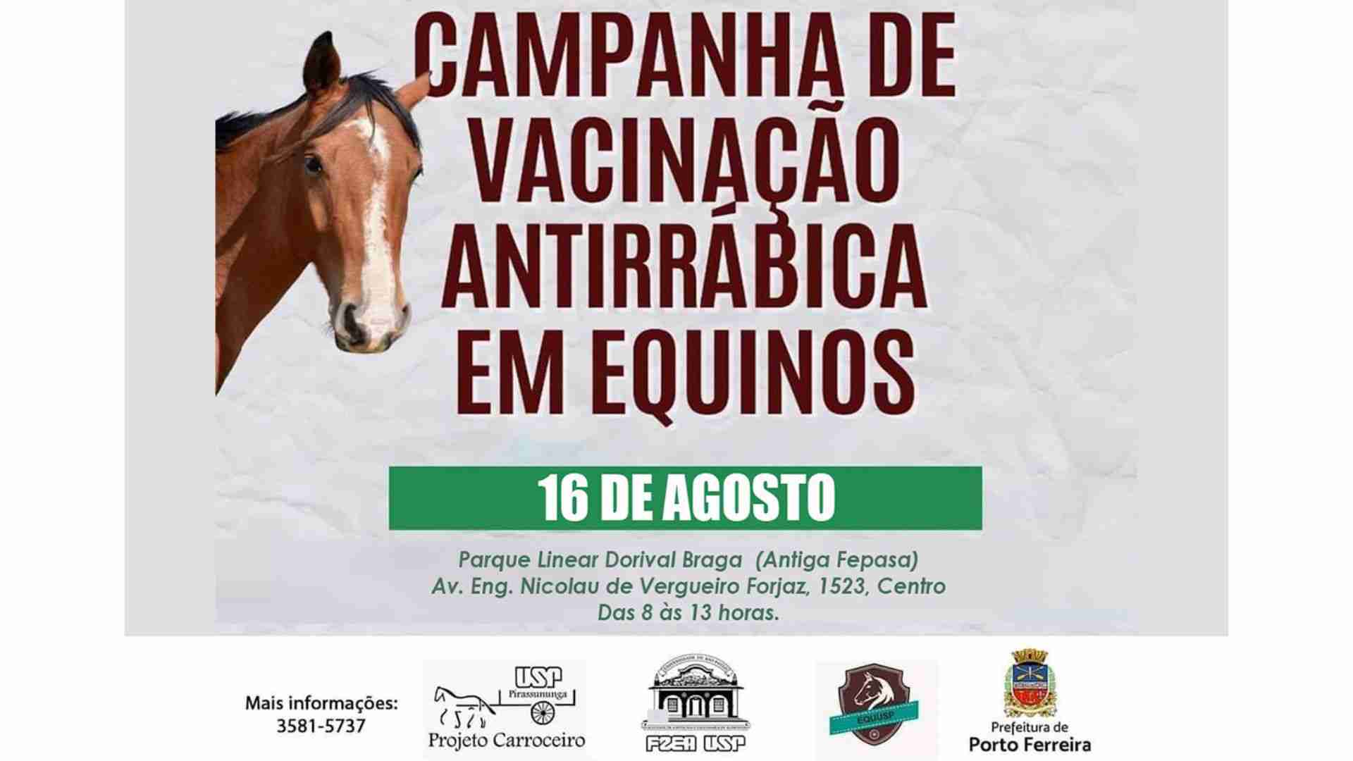O Centro de Controle de Zoonoses Olávio Rodrigues Ribaldo, em parceria com a USP (Universidade de São Paulo), campus de Pirassununga, realizará a campanha anual de vacinação antirrábica e microchipagem para os equinos (cavalos, éguas, pôneis, asnos, mulas, burros) do município de Porto Ferreira, no sábado, 16 de agosto, das 8 às 13 horas, no Parque Linear Dorival Braga (antiga Fepasa – avenida Engenheiro Nicolau de Vergueiro Forjaz, 330, Centro).