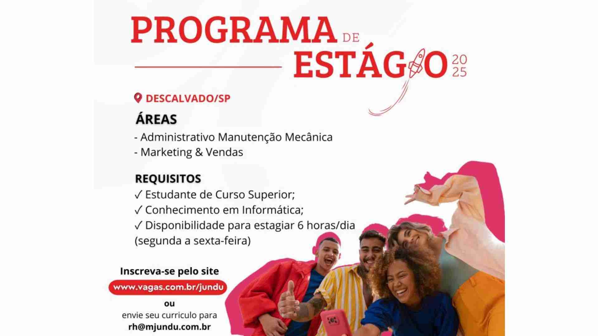 Já pensou em dar os primeiros passos da sua carreira em uma empresa com 65 anos de trajetória, mas que mantém o espírito jovem e inovador? A Jundu, tradicional empresa de mineração sediada em Descalvado (SP), está com inscrições abertas para o Programa de Estágio 2025, uma oportunidade para quem deseja fazer parte de um time que pensa grande e transforma ideias em realidade.
