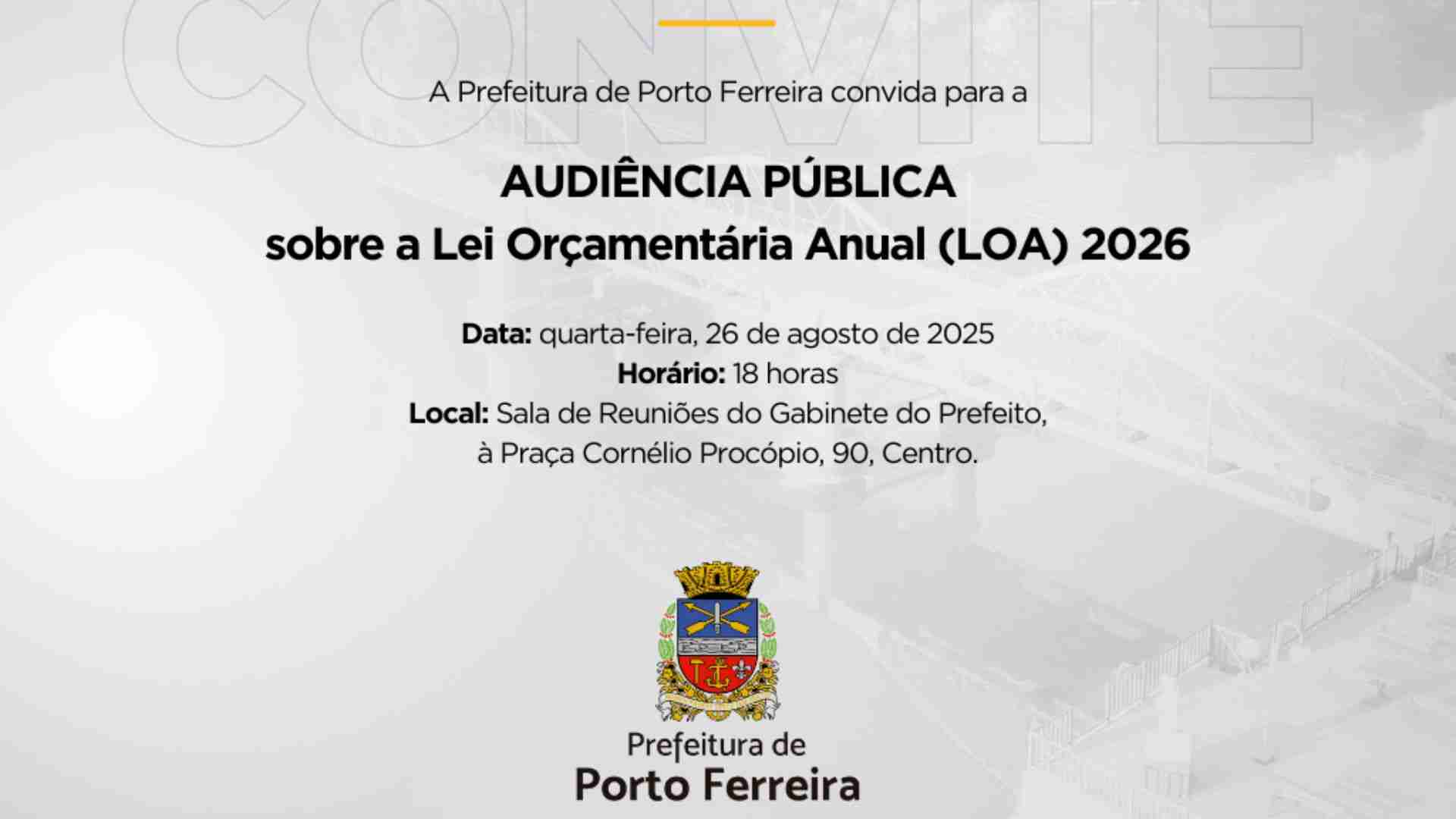 A Prefeitura de Porto Ferreira, cumprindo o disposto no artigo 48º da Lei Complementar 101, de 04 de maio de 2000 (Lei de Responsabilidade Fiscal), convida a população em geral para audiência pública referente a Lei Orçamentária Anual – LOA 2026 do município de Porto Ferreira, que será realizada no próximo dia 26 de agosto (terça-feira), na Sala de Reuniões do Gabinete do Prefeito (praça Cornélio Procópio, 90, Centro). Às 17 horas serão abertas as discussões preliminares, com início da audiência pública às 18 horas. A audiência pública será transmitida pelo canal do YouTube da Prefeitura (https://www.youtube.com/@PrefeituradePortoFerreira2025).