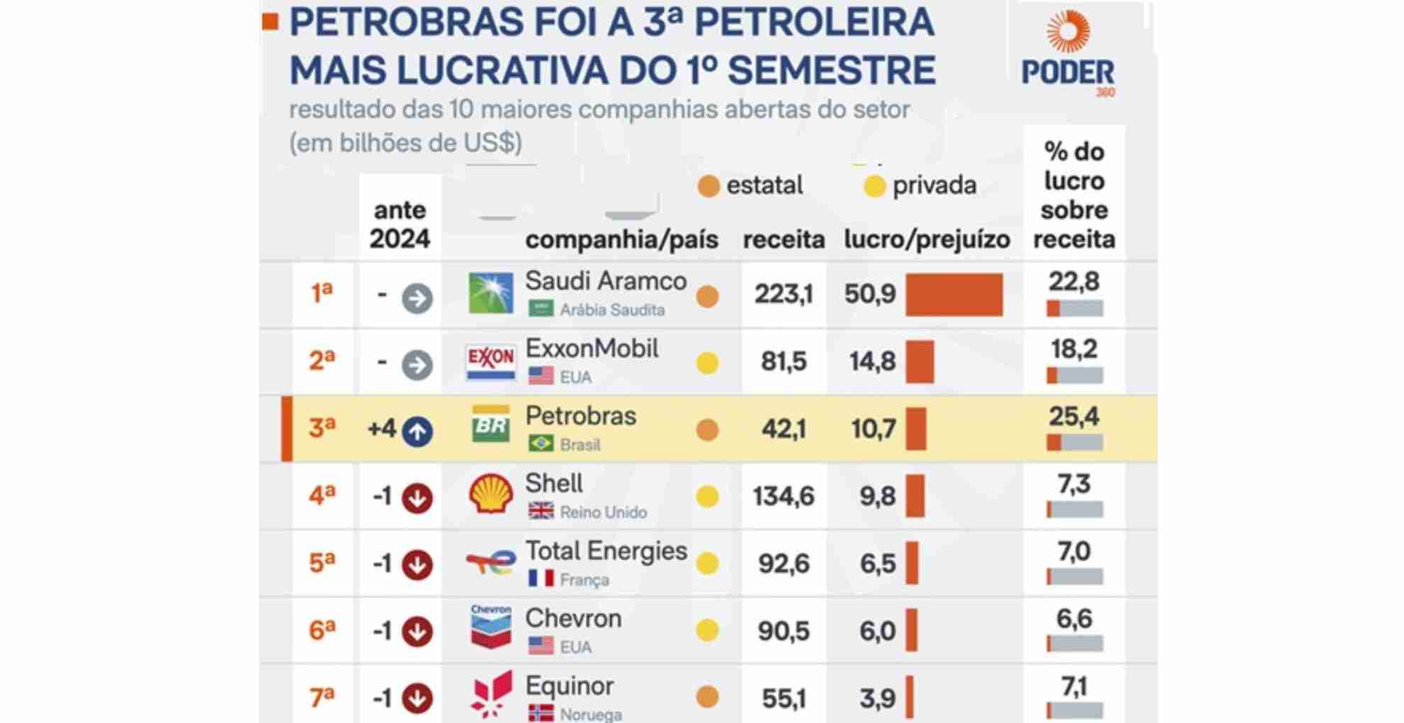 Resultado semestral, impulsionado por alta recorde na produção e ganhos cambiais, marca a melhor colocação da estatal desde 2020, atrás apenas de Saudi Aramco e ExxonMobil