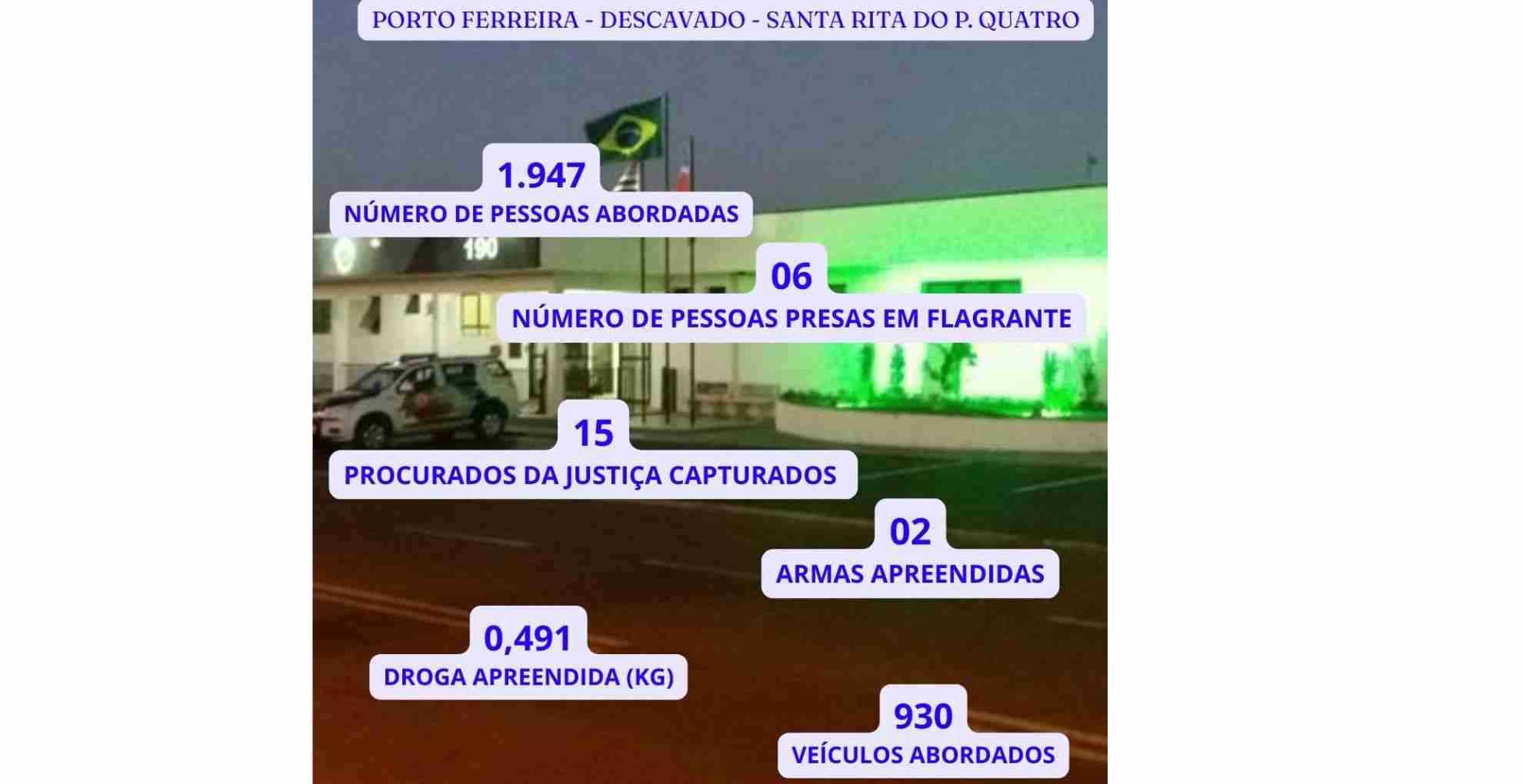 De acordo com os números, 1.947 pessoas foram abordadas durante as operações, resultando em 06 prisões em flagrante e na captura de 15 procurados pela Justiça. Além disso, os policiais apreenderam 02 armas de fogo e 491 gramas de drogas.