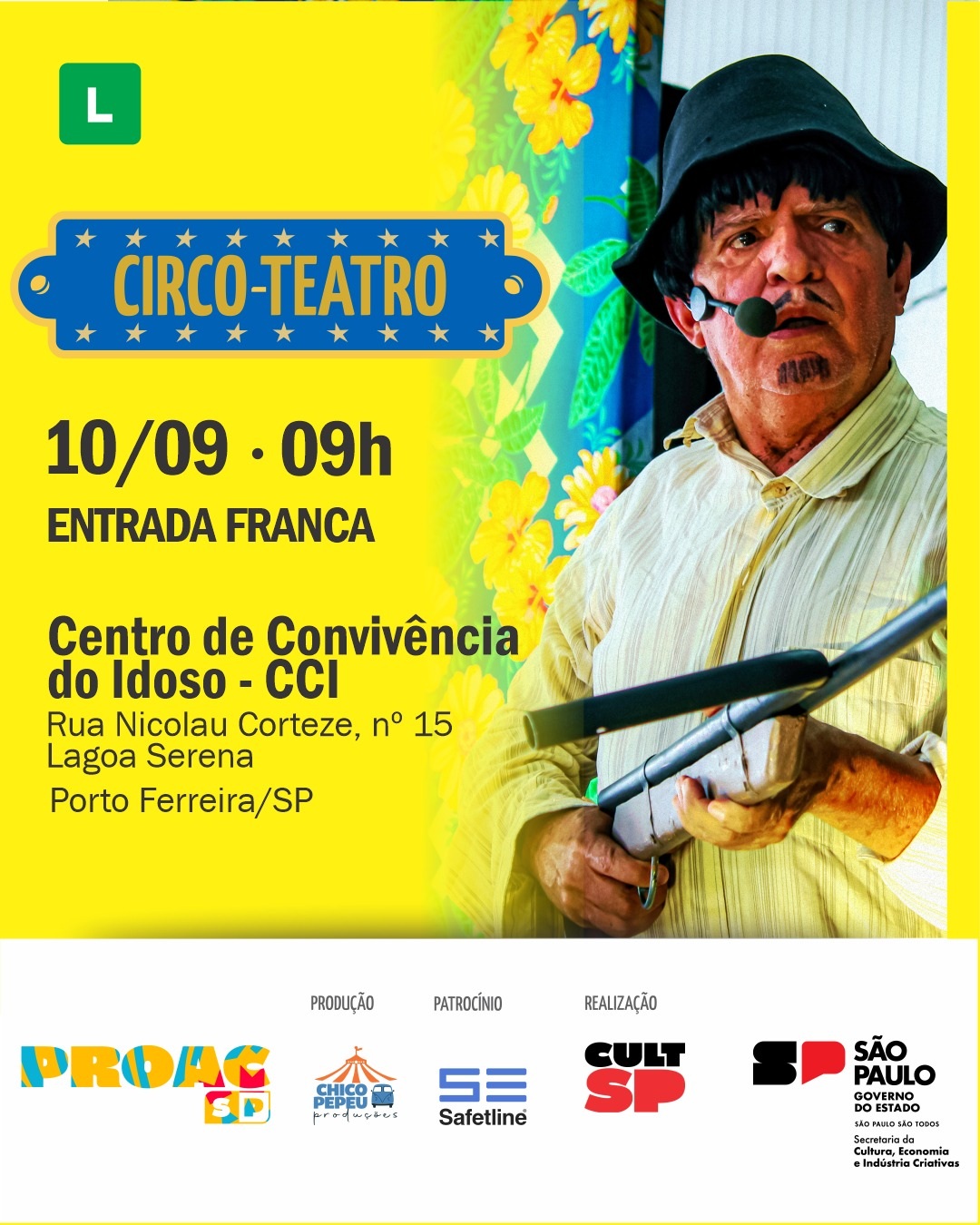 Porto Ferreira recebe na próxima terça-feira, 10 de setembro, o espetáculo do Projeto Circo-Teatro, iniciativa que resgata a tradição do humor circense e caipira em formato itinerante. A apresentação será realizada às 9h, no Centro de Convivência do Idoso (CCI), localizado na Rua Nicolau Corteze, nº 15, no bairro Lagoa Serena. A entrada é gratuita e aberta ao público.