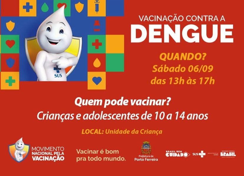 A Vigilância Epidemiológica da Secretaria de Saúde de Porto Ferreira promoverá neste sábado (06/09) um plantão especial de vacinação contra a dengue e a febre amarela, voltado para crianças e adolescentes de 10 a 14 anos. A ação acontece das 13h às 17h, na Unidade da Criança, localizada na rua Francisco Prado, 1.012, no Centro.