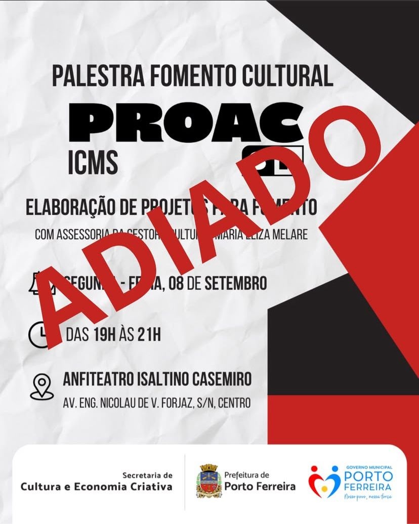 A Secretaria de Cultura e Economia Criativa de Porto Ferreira anunciou o adiamento da Palestra Fomento Cultural PROAC ICMS, que seria realizada nesta semana. A mudança ocorreu por motivo de saúde da palestrante, a gestora cultural Maria Eliza Melare.