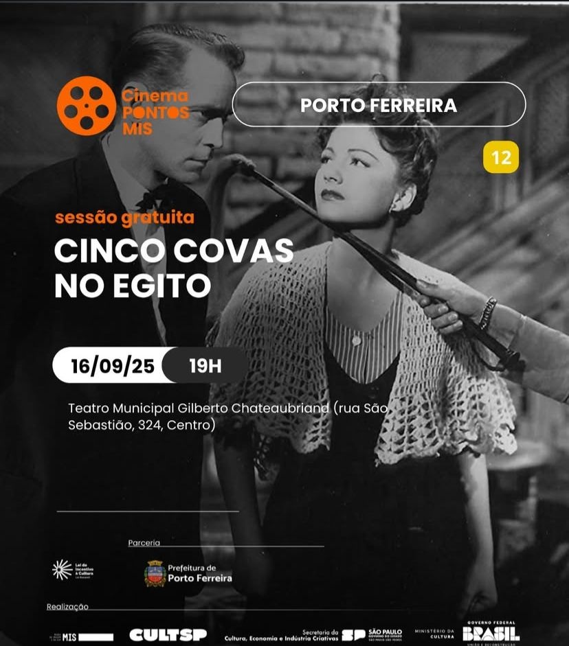A Secretaria de Cultura e Economia Criativa de Porto Ferreira, em parceria com o Museu da Imagem e do Som de São Paulo (MIS-SP), promove mais uma sessão do projeto Pontos MIS. Na próxima quarta-feira, 16 de setembro, às 19h, será exibido o filme “Cinco Covas no Egito”, dirigido por Billy Wilder.