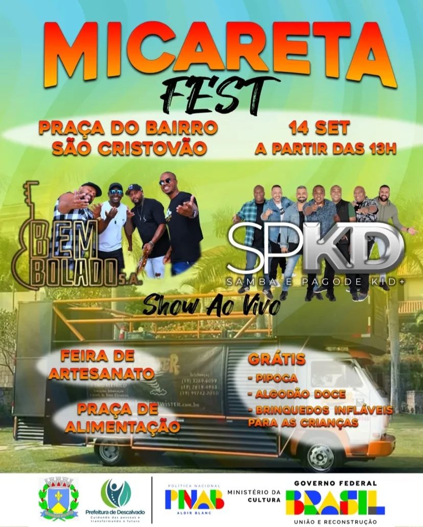 A alegria vai tomar conta de Descalvado no próximo domingo, 14 de setembro, a partir das 13h, com a realização do Micareta Fest na Praça do Bairro São Cristóvão. O evento traz uma programação especial para toda a família, reunindo música, gastronomia e atividades infantis.