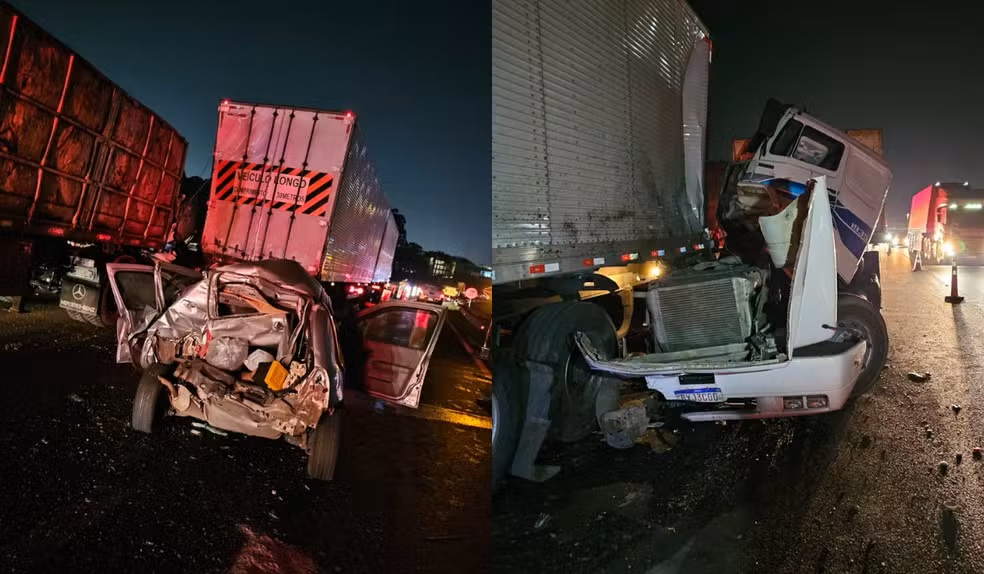 Imagens registradas no local mostram que a cabine de um dos caminhões e um dos automóveis ficaram destruídos. Equipes da AutoBan, concessionária que administra a via, foram acionadas para atender a ocorrência e organizar o tráfego.