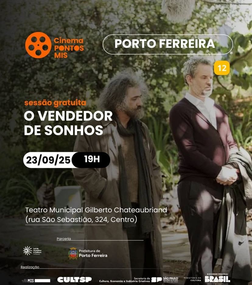 A Secretaria de Cultura e Economia Criativa de Porto Ferreira promove nesta terça-feira (23) mais uma edição do projeto Pontos MIS, realizado em parceria com o Museu da Imagem e do Som de São Paulo. O público poderá assistir gratuitamente ao filme O Vendedor de Sonhos, dirigido por Jayme Monjardim, no Teatro Municipal Gilberto Chateaubriand, localizado na Rua São Sebastião, 324, no Centro. A sessão começa às 19h.