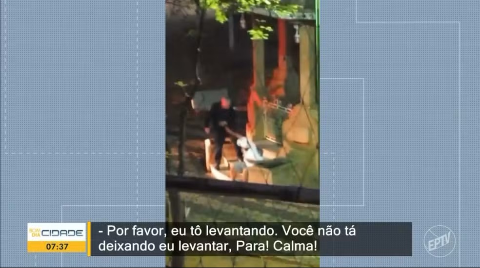 Na gravação, a vítima, que aparenta estar alcoolizada e com dificuldade para se levantar, é golpeada diversas vezes com um cassetete. Em meio às agressões, o homem implora: “Por favor, eu tô levantando. Você não tá deixando eu levantar. Para! Calma.”
