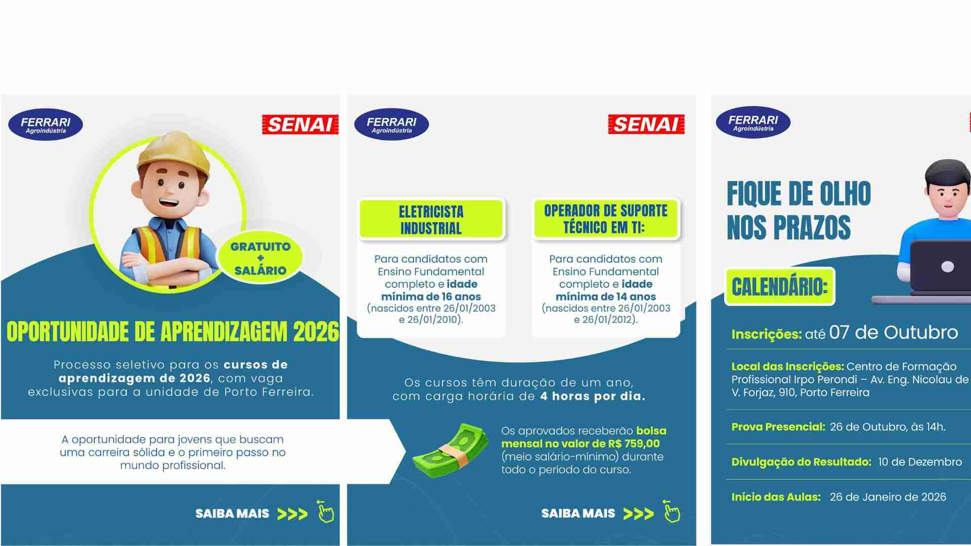 A Ferrari Agroindustrial anunciou a abertura do Programa de Aprendizagem 2026, em Porto Ferreira (SP). São 40 vagas disponíveis para jovens interessados em iniciar uma carreira nas áreas de Eletricista Industrial e Operador de Suporte Técnico em TI.