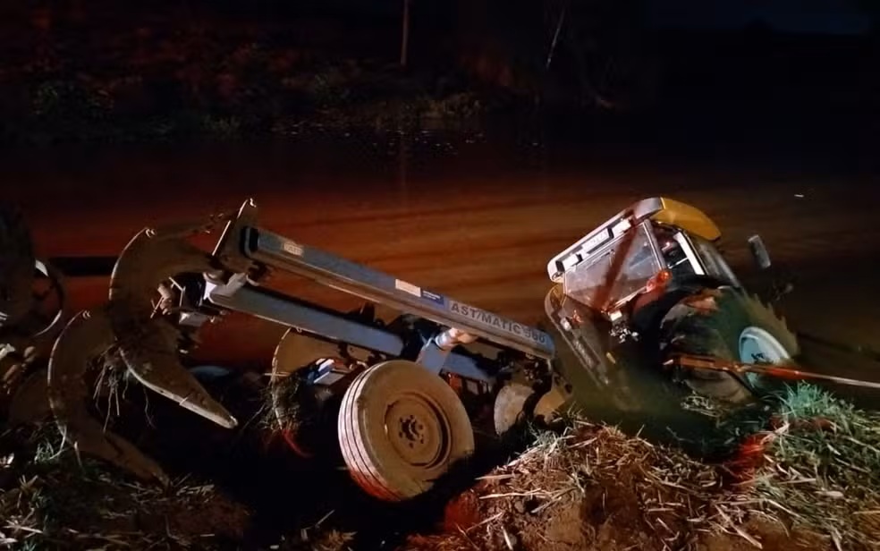 De acordo com o Corpo de Bombeiros, a corporação foi acionada por volta das 18h45. Ao chegar ao local, os militares encontraram o veículo parcialmente submerso, com parte da cabine ainda visível. O condutor, que não teve a identidade divulgada, estava preso dentro do trator.