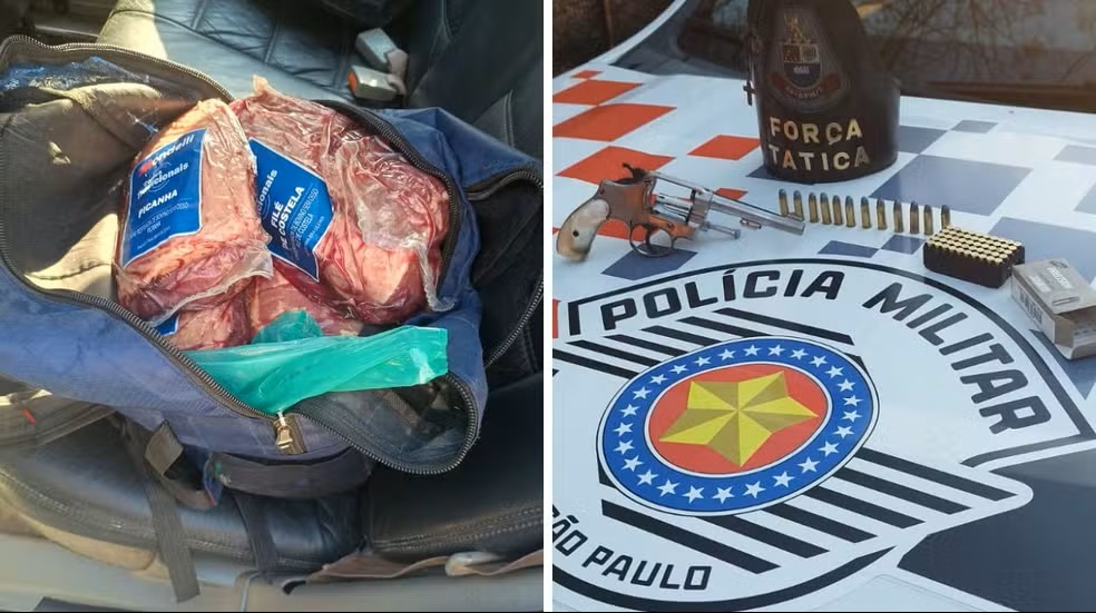 Dois homens foram presos em flagrante nesta segunda-feira (29), em Pirassununga (SP), durante a realização da “Operação Impacto” pela Polícia Militar. A dupla é suspeita de furto qualificado e porte ilegal de arma de fogo. Com eles, os policiais encontraram um revólver calibre 32, dezenas de munições e cerca de 24 quilos de carne furtada de um restaurante da cidade.