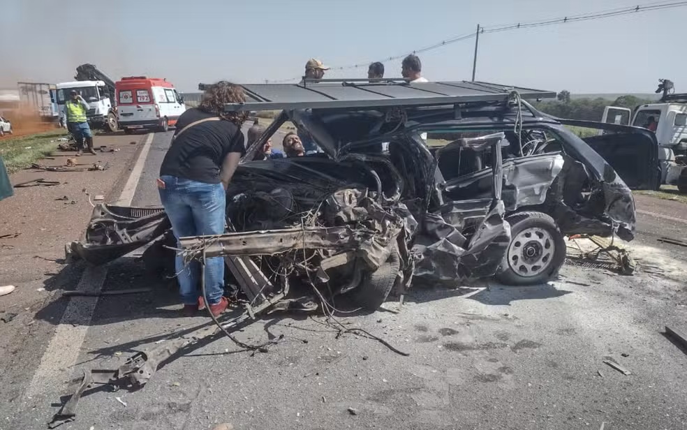 Ainda segundo a corporação, o motorista do carro perdeu o controle da direção em um trecho de pista simples, invadiu a contramão e atingiu a lateral de uma carreta que vinha no sentido oposto. O impacto foi tão forte que destruiu completamente o carro.