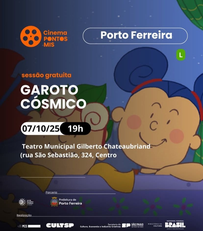A Secretaria de Cultura e Economia Criativa de Porto Ferreira promove, em parceria com o Museu da Imagem e do Som de São Paulo (MIS), mais uma edição do projeto Pontos MIS, que leva sessões de cinema gratuitas à população. Nesta terça-feira, 7 de outubro, o público poderá conferir o filme “Garoto Cósmico”, animação brasileira dirigida por Alê Abreu, no Teatro Municipal Gilberto Chateaubriand, a partir das 19h.