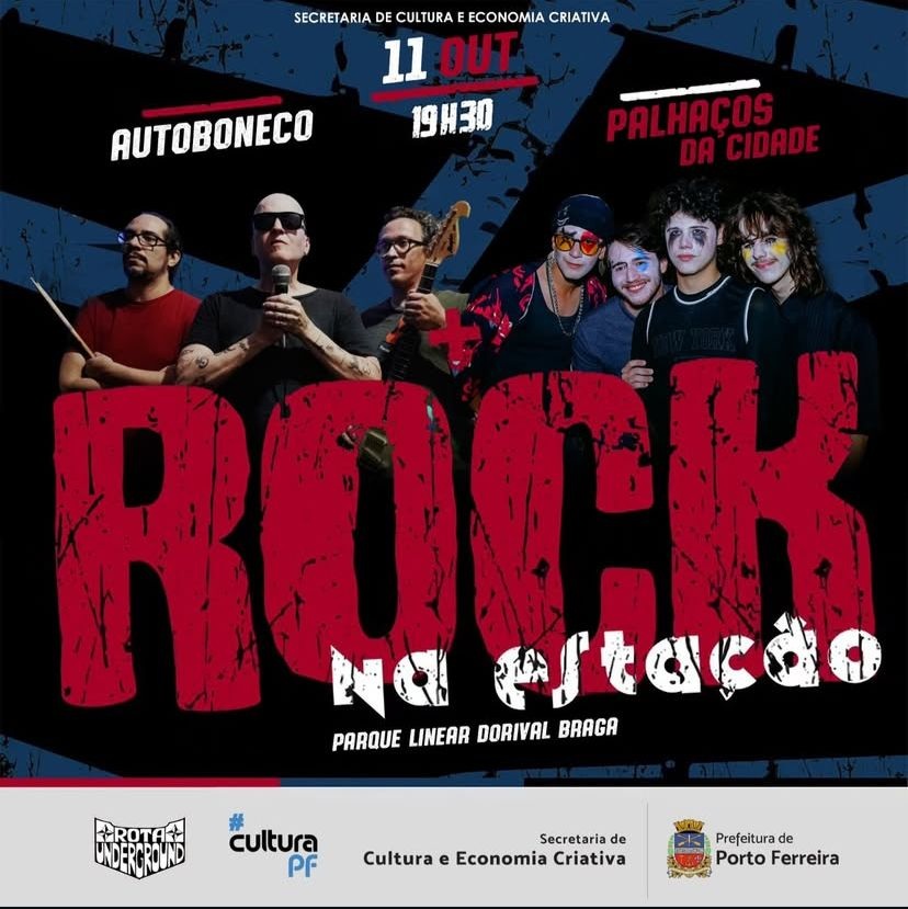 A edição de outubro do projeto Rock na Estação promete movimentar a cena cultural de Porto Ferreira neste sábado, dia 11 de outubro, com apresentações das bandas Autoboneco e Palhaços da Cidade. O evento, que tem entrada gratuita, acontece a partir das 19h30, em frente ao Museu Municipal, localizado no Parque Linear Dorival Braga, na avenida Engenheiro Nicolau de Vergueiro Forjaz, no Centro da cidade.